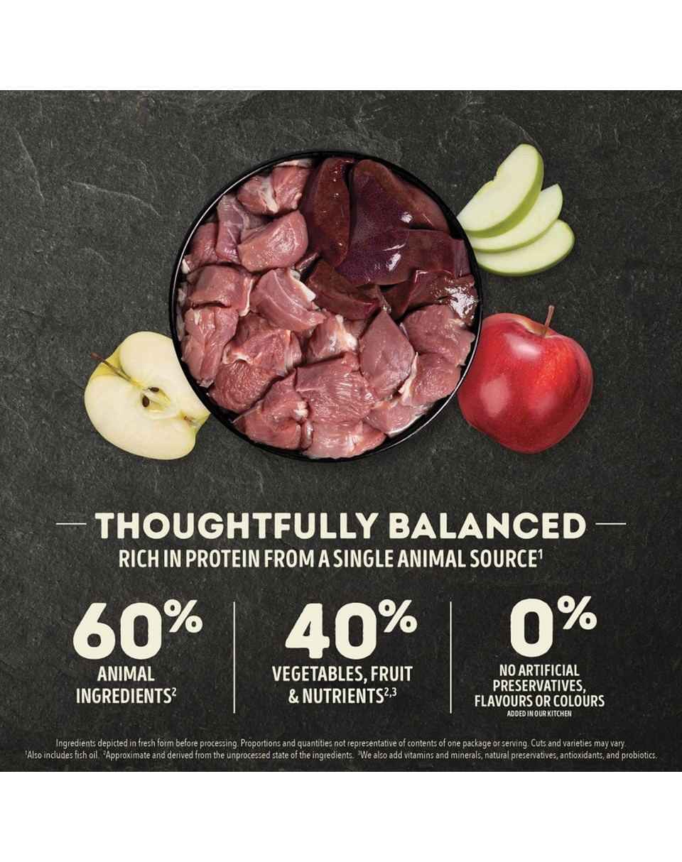 Monoproteines teljes értékű eledel felnőtt kutyák számára. Jellemzője a felhasznált termékek magas minősége, ami növeli az emészthetőségét. A receptet úgy fejlesztették ki, hogy a kutyák alkalmazkodjanak a speciális élelmiszerek beviteléhez és emésztéséhez. A húsevők számára az állati eredetű fehérje a legértékesebb. Ez garantálja az összes tápanyag és ásványi anyag gyors bevitelét. Az eledel 50% friss nyers bárányhúst tartalmaz. A bárányhús zsenge hús, és ebben az ételben ez az egyetlen állati fehérjeforrás. A monoproteines eledel alkalmas allergiás kutyák etetésére, valamint az eliminációs diéta elvégzésekor, azaz az egyes termékek kizárásakor, hogy kiderüljön, melyik az allergizáló tényező. A gyümölcsök, zöldségek és fűszernövények hozzáadása az ételhez javítja annak ízletességét és ízét. Az alma, a sütőtök, az áfonya és az áfonya természetes vitaminokat és antioxidánsokat tartalmaz, amelyek támogatják az immunrendszert. A tengeri algák biztosítják az összes tápanyagot, vitamint és ásványi anyagot.