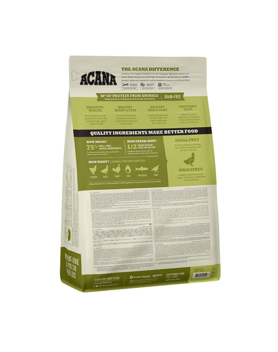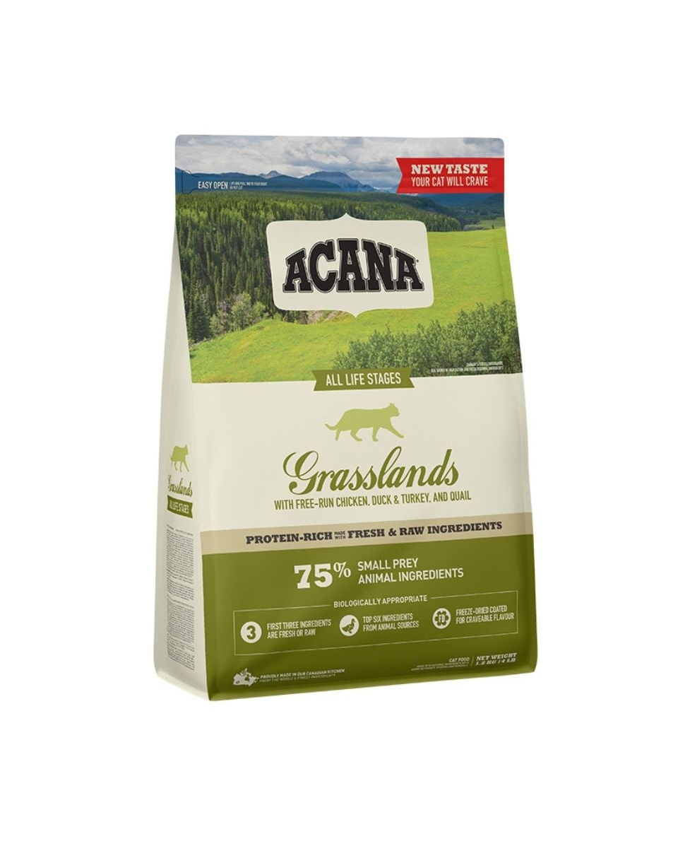 Kalóriatartalom-és megoszlás ME (számított metabolikus energiatartalom) = 3 930 kcal/kg, vagy 472 kcal per 250 ml-es pohár (120 g). Az energia 38 %-a fehérjékből, 39 %-a zsírokból, 23 %-a szénhidrátokból származik. Az ACANA Grasslands Cat több kalóriát biztosít fehérjékből és zsírokból, mint szénhidrátokból, azaz a makrotápanyagok ideális arányban látják el a szervezetet energiával, ennek köszönhetően a macska folyamatosan csúcsformában lesz.