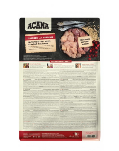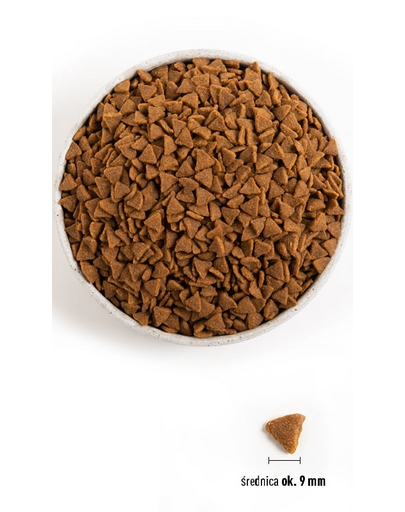 Friss csirkehús (16 %), dehidratált csirkehús (16 %), dehidratált hering (16 %), egész zab, egész borsó, csirkezsír (5 %), őrölt japánfű, egész zöldlencse, friss pulykahús (4 %), nyers egész hering (4 %), egész csicseriborsó, egész vöröslencse, lencserost, nyers egész nyúl (1 %), friss csirkebelsőségek (máj, szív) (1 %), friss pulykabelsőségek (máj, szív) (1 %), csirkeporc (1 %), szárított moszat, friss egész pézsmatök, friss egész úritök, friss egész vörös áfonya, friss egész kék áfonya. Adalékanyagok (per kg): Technológiai adalékok: természetes antioxidánsok. Tápanyagadalékok: kolin-klorid: 1200 mg, taurin: 400 mg, cink (aminosavak cink-kelátjának hidrátja): 150 mg, B1-vitamin: 25 mg, B2-vitamin: 10 mg, niacin: 50 mg, B5-vitamin: 8 mg, B6-vitamin: 7.5 mg, folsav: 0.75 mg, biotin: 0.03 mg, B12-vitamin: 0.1 mg, A-vitamin: 1875 NE, D-vitamin: 250 NE, E-vitamin: 175 NE, réz (aminosavak réz(II)-kelátjának hidrátja: 11 mg, L-karnitin: 50 mg, DL-metionin: 99 mg. Zootechnikai adalékok: Enterococcus faecium NCIMB10415: 600x10^6CFU.