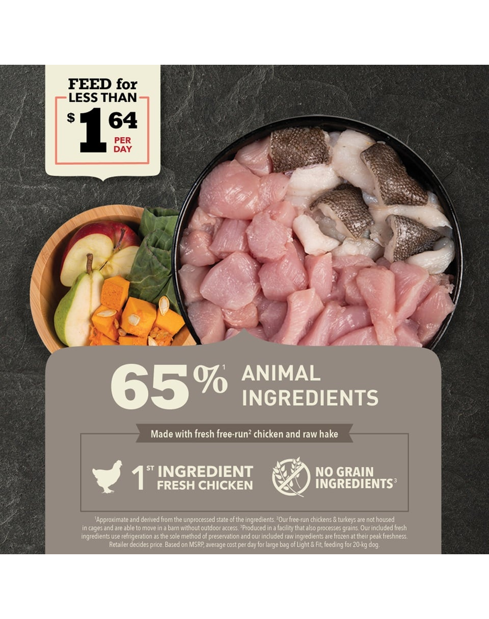 Az ACANA Light & Fit nem tartalmaz növényi fehérjekivonatokat, a felhasznált alapanyagok 65 %-a állati eredetű - ez közel kétszer olyan nagy mennyiség, mint egy átlagos prémium minőségű termék esetében.