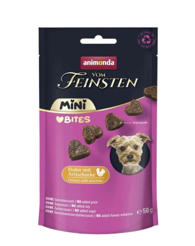 A Vom Feinsten Mini Bites csirke articsókával egy ízletes falat, amelyet kifejezetten kis testű kutyák számára készítettek. A szív alakú jutalomfalatok ideálisak edzés közben vagy kis falatként az étkezések között.