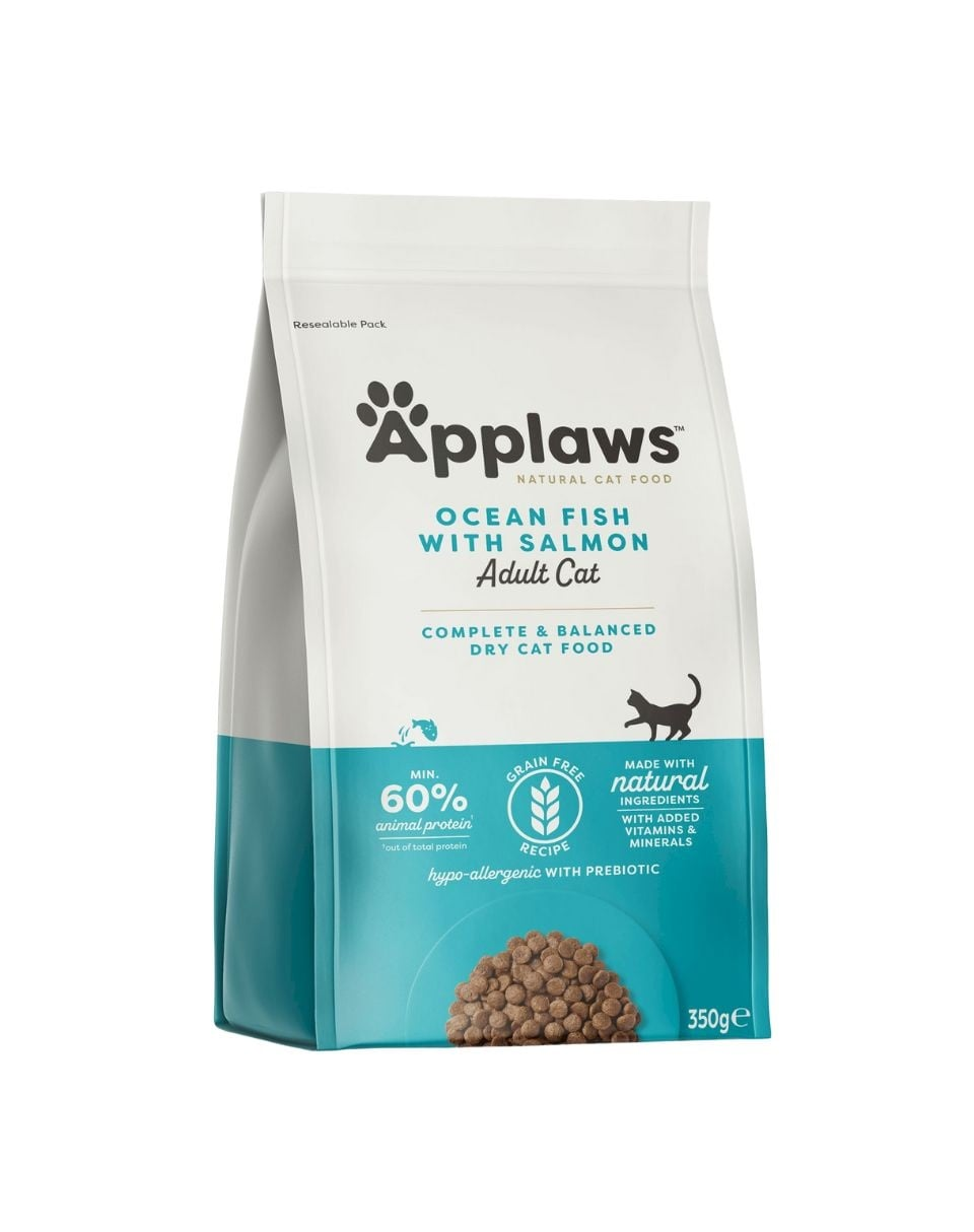 Óceáni halak 45,5% (frissen elkészített fehér hal* 18%, heringliszt 12%, frissen elkészített lazac* 8%, halliszt 5%, lazacliszt 2,5%), burgonya*, szárított borsó*, lazacolaj 5%, lenmag*, szárított sörélesztő*, halmártás 2,5%, vitaminok és ásványi anyagok, cukorrépa-pép*, szárított sárgarépa*, szárított paradicsom*, cikória kivonat* 0,2% (prebiotikus FOS forrás), tengeri moszat*, Schidigera yucca kivonat*, áfonyapor. *Természetes összetevők.