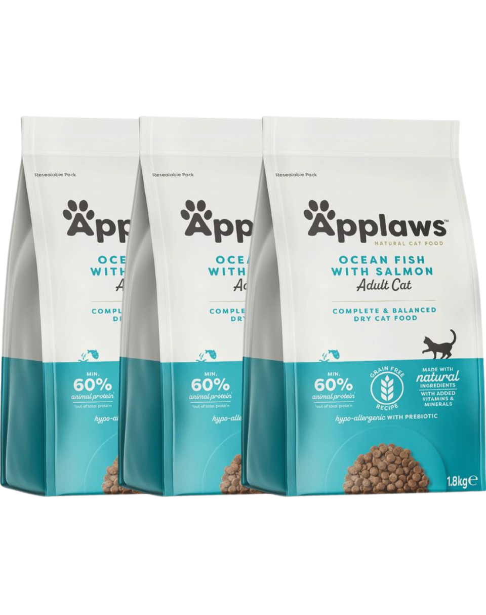 Óceáni halak 45,5% (frissen elkészített fehér hal* 18%, heringliszt 12%, frissen elkészített lazac* 8%, halliszt 5%, lazacliszt 2,5%), burgonya*, szárított borsó*, lazacolaj 5%, lenmag*, szárított sörélesztő*, halmártás 2,5%, vitaminok és ásványi anyagok, cukorrépa-pép*, szárított sárgarépa*, szárított paradicsom*, cikória kivonat* 0,2% (prebiotikus FOS forrás), tengeri moszat*, Schidigera yucca kivonat*, áfonyapor. *Természetes összetevők.