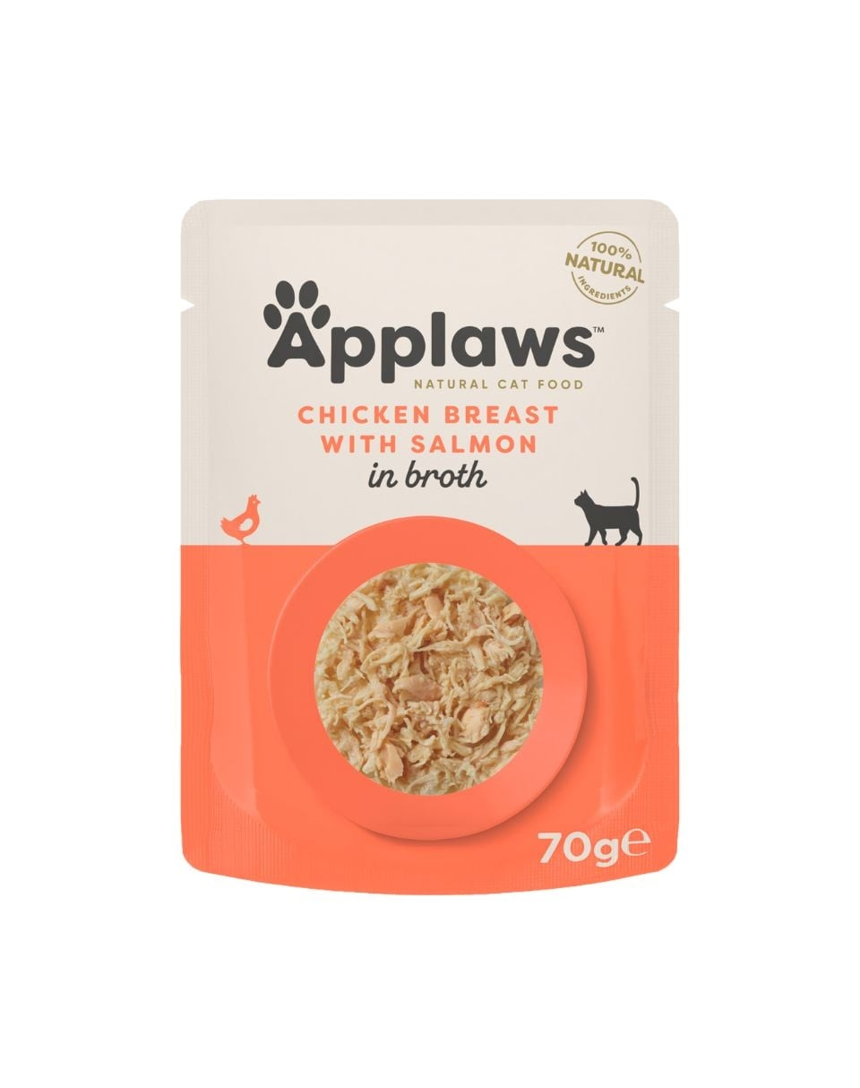 Applaws Cat Adult Chicken with Salmon in Broth egy természetes, gabonamentes kiegészítő táplálék felnőtt macskák számára.