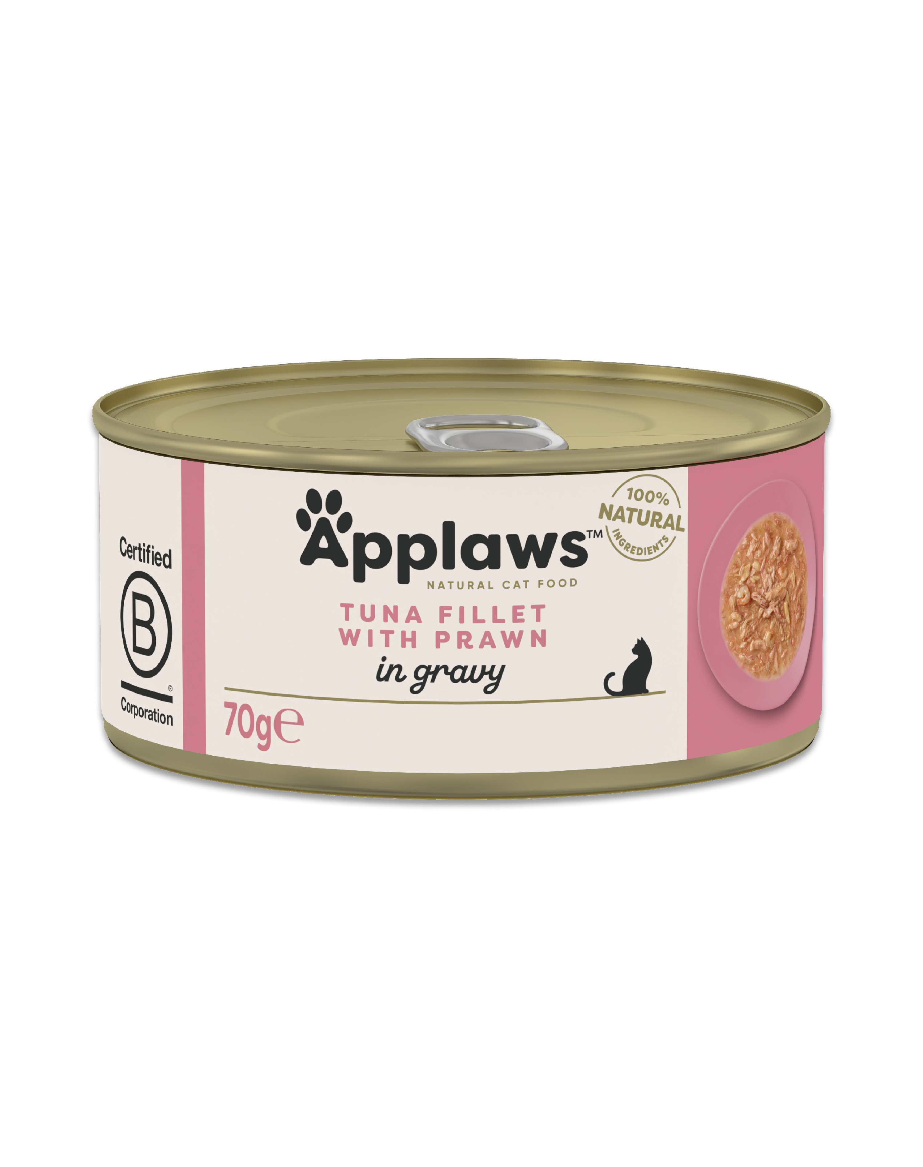Applaws Cat Adult Tuna with Prawn in Gravy egy természetes, gabonamentes kiegészítő táplálék felnőtt macskák számára.