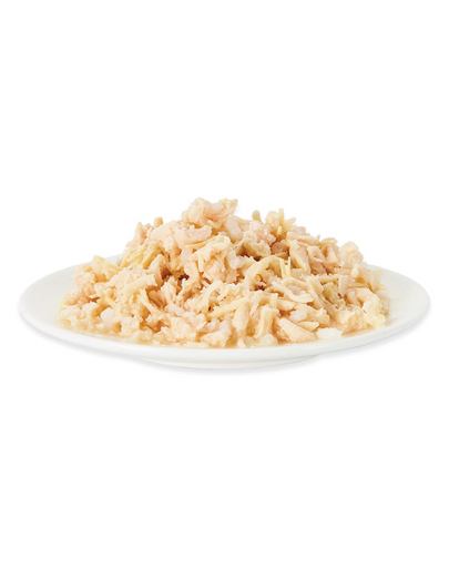 Csirkemell 75%, rizs 1%, csirkeleves 24%. Adalékanyagok nélkül.