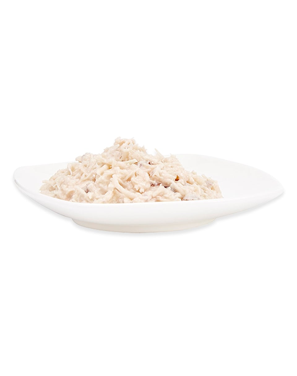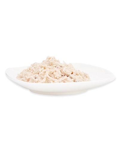 Az eledel válogatott összetevőket tartalmaz - tiszta csirkehúsdarabokat, rizs hozzáadásával.