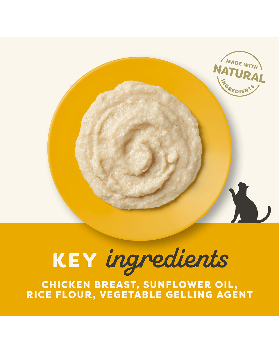 Csirkemell 44%, napraforgóolaj, rizsliszt, növényi zselésítőanyag.