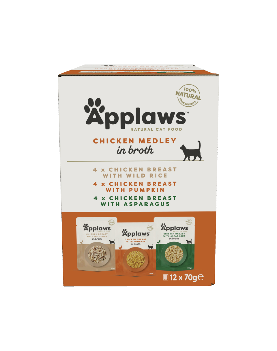Az étel válogatott összetevőket tartalmaz - tiszta csirkehúsdarabokat, rizs és sütőtök hozzáadásával. A jelentős mennyiségű zöldség hozzáadása növeli a rostok mennyiségét, ezért segíthet a székrekedésben szenvedő macskáknak.
