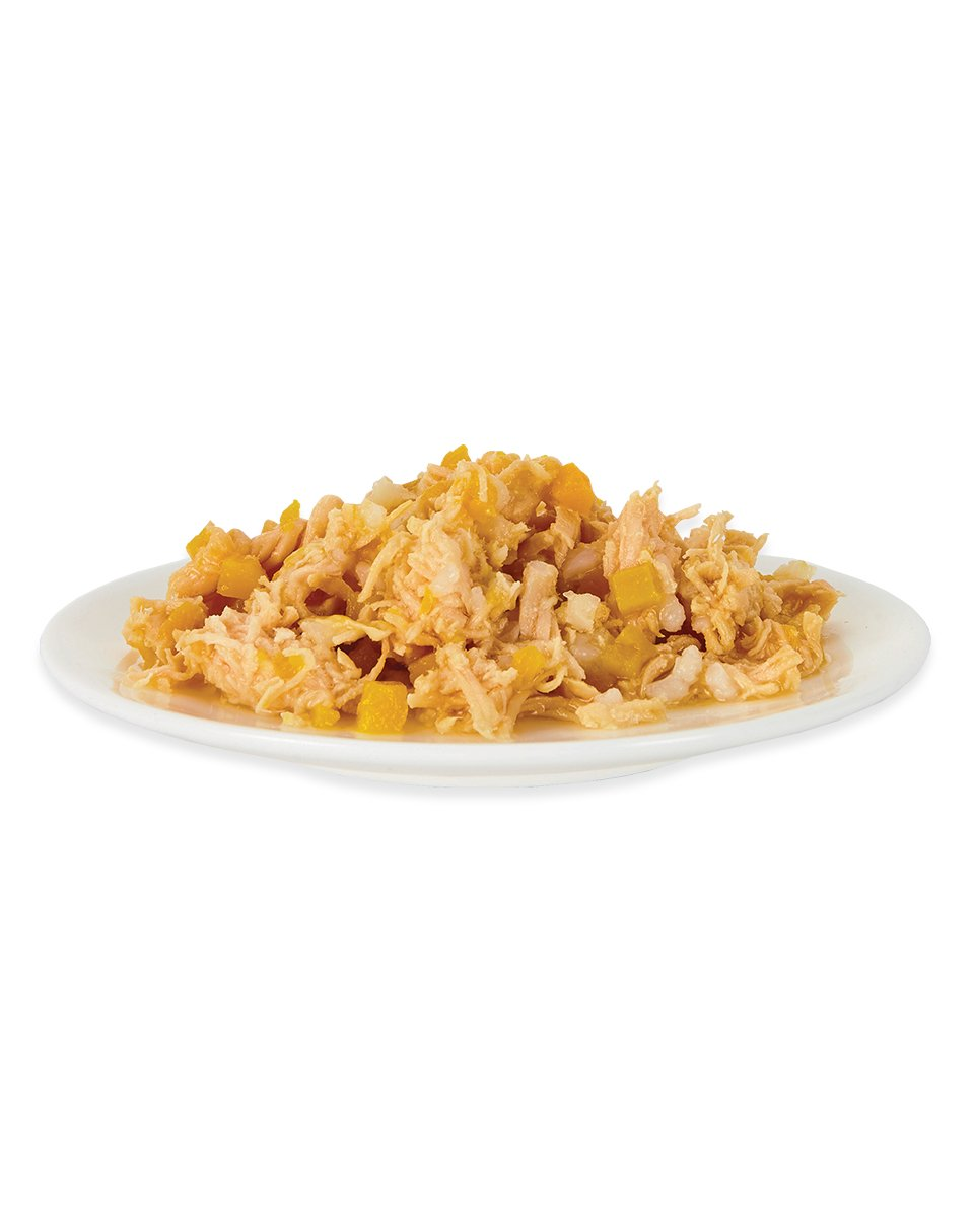 Csirkemell 50%, csirkeleves 25%, sütőtök 24%, rizs 1%.