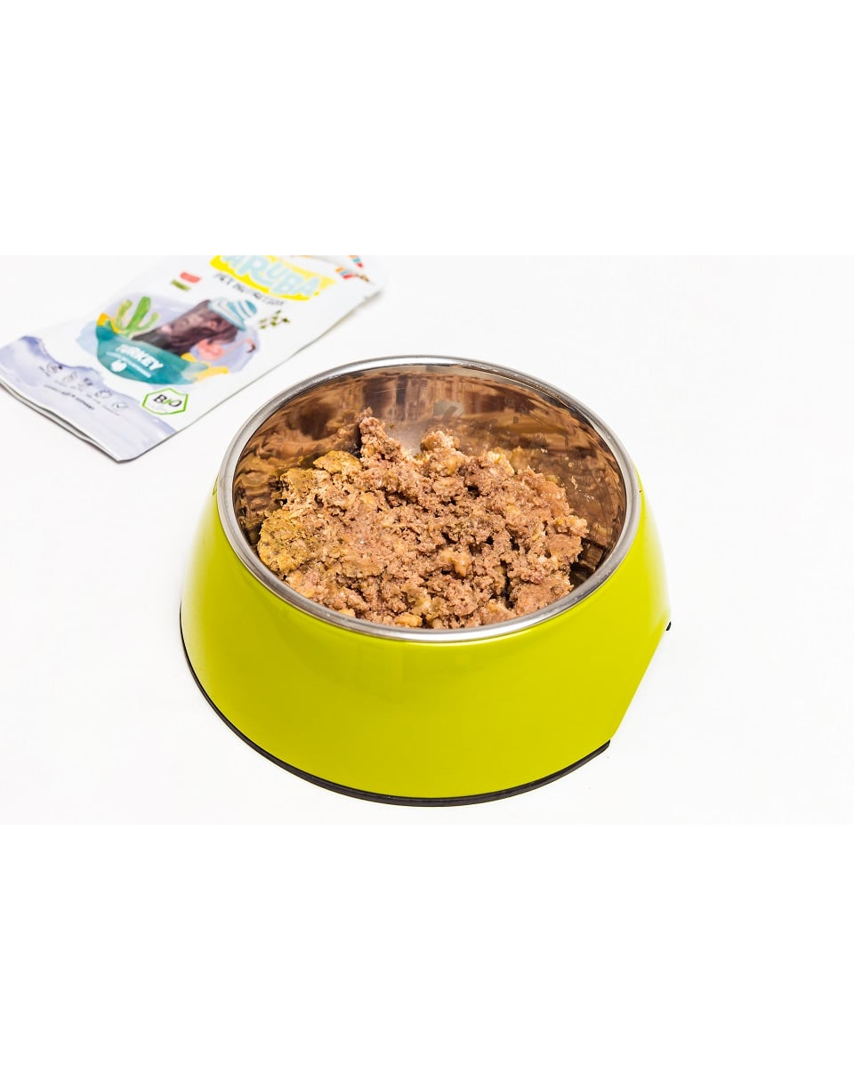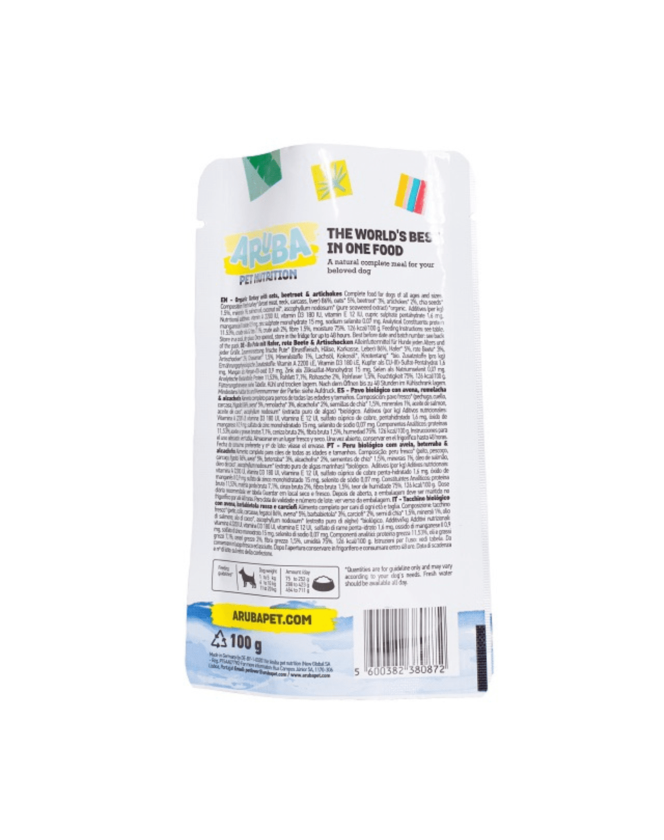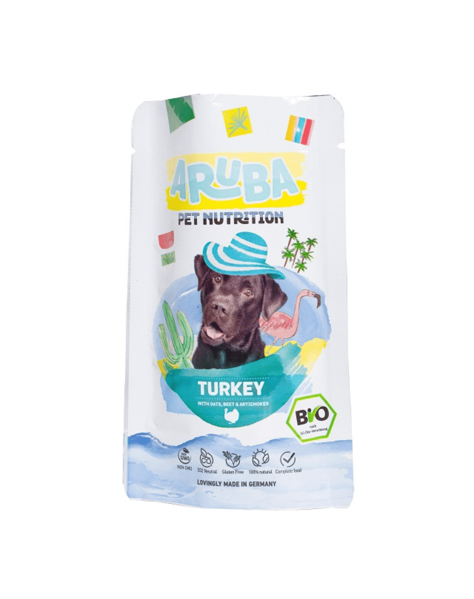 Az Aruba bio pulyka zabbal, céklával és articsókával receptje egy ízletes módja annak, hogy kutyájának fantasztikus tápértéket adjon egyetlen nedves tasakban. A pulyka alacsony zsírtartalmú fehérjeforrás és tele van B-vitaminokkal, emellett szelénben és triptofánban is gazdag, mindkettő nagyszerű az immunrendszer számára.
