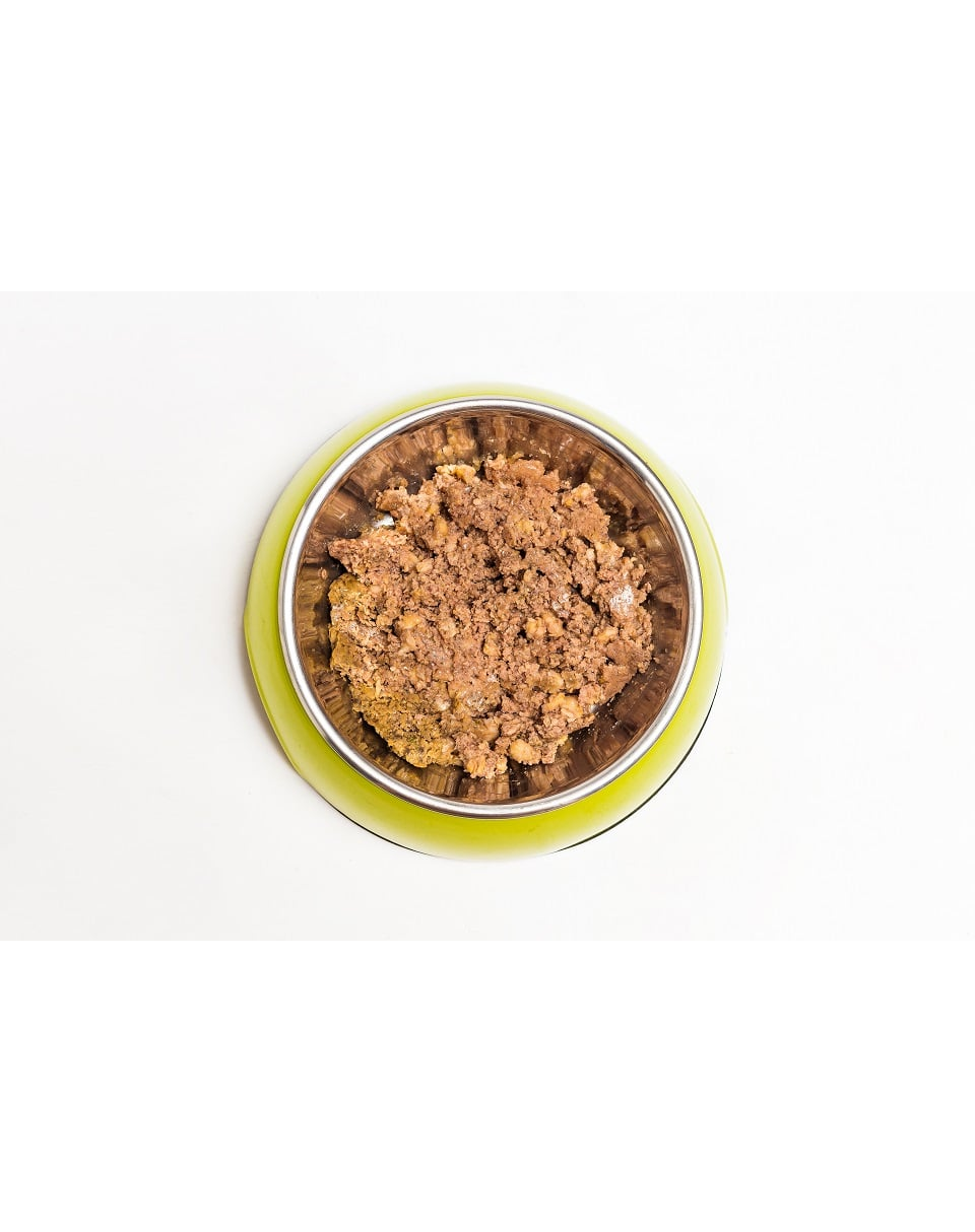 Összetevők: friss pulyka* (mellhús, nyak, hasított test, máj) 86%, zab* 5%, cékla* 3%, articsóka* 2%, chia mag* 1,5%, ásványi anyagok 1%, lazacolaj, kókuszolaj*, Ascophyllum nodosum* (tiszta tengeri moszat kivonat) *szervesen.