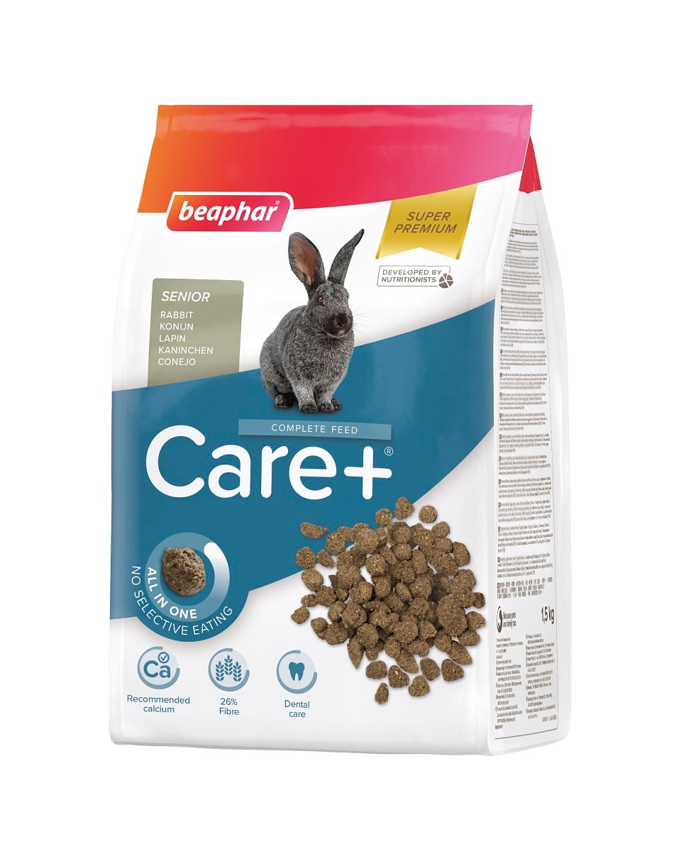Care+ Senior Rabbit egy kivételesen ízletes, szuper prémium minőségű eledel. Receptjét állatorvosokkal és táplálkozási szakemberekkel együttműködve fejlesztették ki. A Care+ extrudálási eljárással készül, ezért minden pellet azonos összetételű (all-in-one). Ennek eredményeképpen nincsenek maradékok, és a tenyésztők biztosak lehetnek abban, hogy az egészséghez szükséges összes összetevőt elfogyasztották - ez teljesen kiküszöböli az ízletesebb táplálékösszetevők szelektív elfogyasztásának jelenségét. A pelletek keménysége elősegíti a megfelelő fogkopást. A gyártás során elért hőmérséklet javítja a fehérje emészthetőségét. A pelleteket alacsony kalciumtartalom, a fontos, többszörösen telítetlen Omega 6 és Omega 3 zsírsavak kiegyensúlyozott szintje (búzából, szójából és lenmagból származnak), megfelelő élelmirost-tartalom és aromás timothykivonat hozzáadása különbözteti meg. Fontos antioxidáns funkciót lát el a C-vitamin, az E-vitamin, a zöld tea kivonat és a ginzeng, így támogatva a nyúl természetes védekezőképességét. A Care+ Senior Rabbit alacsony fehérjetartalmú és nem tartalmaz hozzáadott cukrot, hogy megelőzze az elhízást ezeknél a kevésbé aktív nyulaknál. A Care+ Senior Rabbit tökéletesen kiegyensúlyozott eledel idősebb nyulak számára, amely kielégíti minden természetes tápanyagszükségletüket.