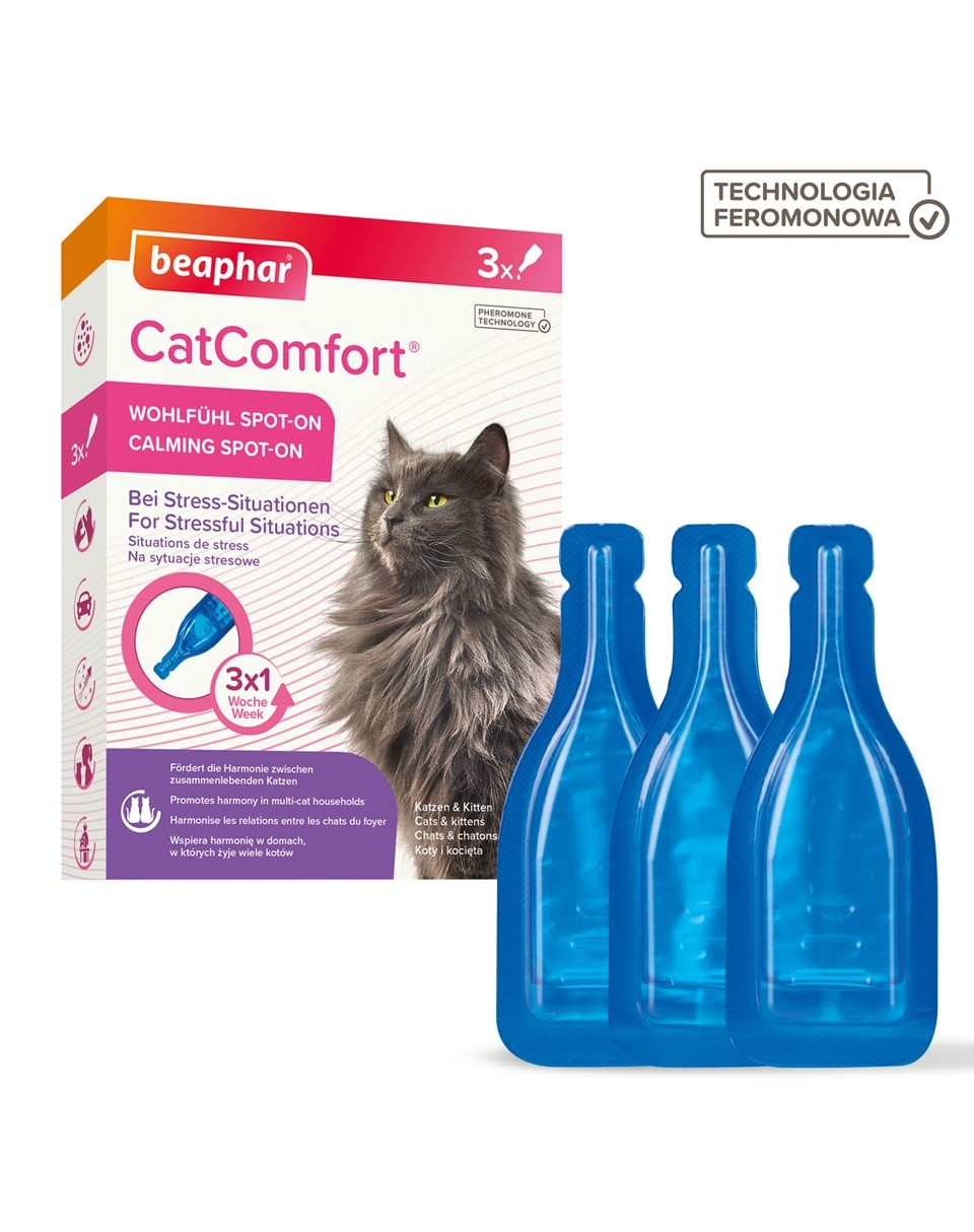 A Beaphar CatComfort Calming Spot-On nyugtató feromonok cseppekben macskák számára nyugtató hatással vannak az állatokra, csökkentve stresszszintjüket nehéz helyzetekben, például költözéskor.