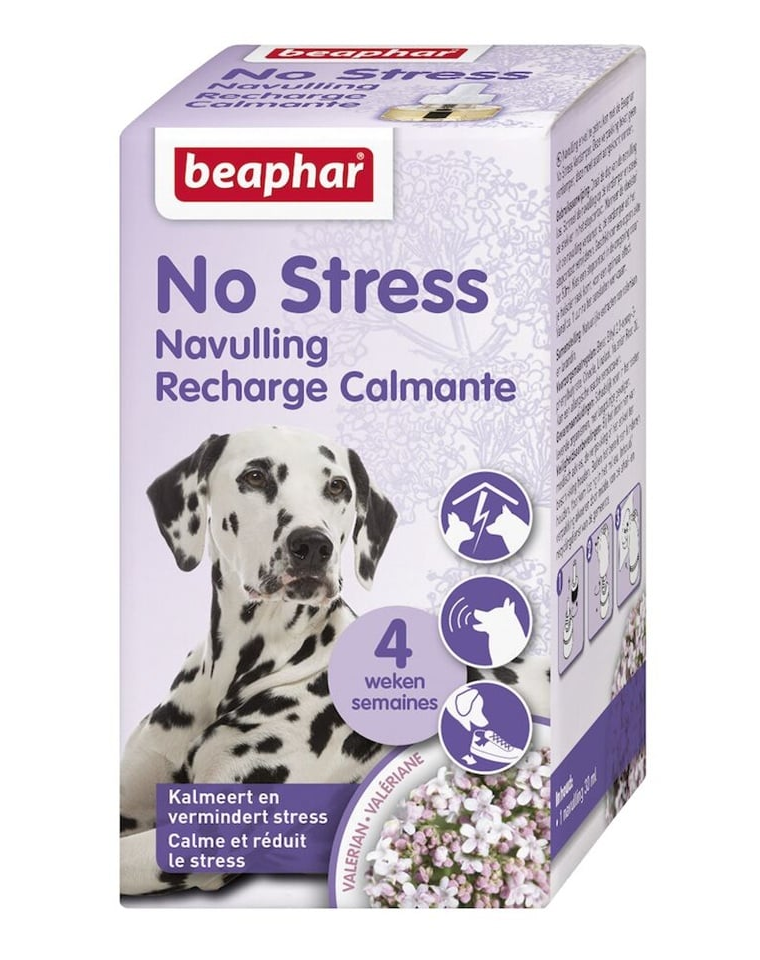 A No Stress Refill kutyák számára egy cserélhető utántöltő a nyugtató diffúzorhoz, amely természetes valeriana és levendula kivonatok alapján készült. Segít csökkenteni a stresszt és a nem kívánt viselkedéseket kutyákban, mint például a túlzott ugatás, tárgyak rágása vagy agresszió. A termék minden fajtájú, méretű és korú kutyának készült. Ideális olyan állatok számára, amelyek hosszú ideig egyedül tartózkodnak otthon, költözéskor, vagy új emberek és tárgyak bevezetésekor. Csökkenti a túlzott ugatás, tárgyak rágása vagy agresszív viselkedés problémáit.