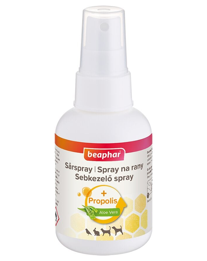 Beaphar Wound Spray egy kíméletes készítmény, amely a kisebb sebek, horzsolások, dörzsölések és csípések tisztítására és ápolására szolgál minden háziállat fajtájánál – kutyák, macskák, nyulak, rágcsálók, madarak vagy lovak. A természetes összetevők tartalmának köszönhetően segíti a gyógyulási folyamatot és megelőzi a fertőzéseket. Propolist és aloe verát tartalmaz, ideális a bőr megnyugtatására kullancs- vagy rovarcsípés után.