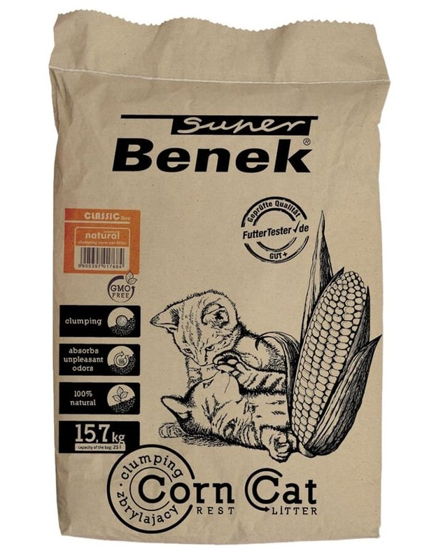 Csomós, teljesen biológiailag lebomló macskaalom. Természetes növényi anyagból, kémiai adalékanyagok nélkül gyártják. Nagy teljesítményének köszönhetően ideális több macska tulajdonosai számára. Természetes kukoricaillata van.