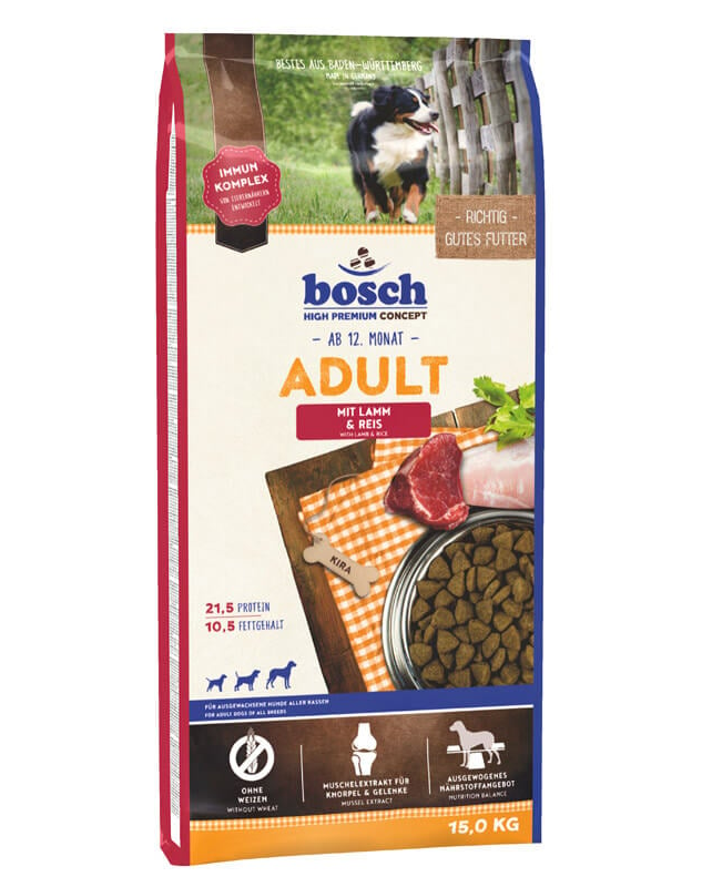 A Bosch Adult Lamb & Rice egy kiegyensúlyozott teljes értékű eledel minden felnőtt kutyának, normális aktivitás esetén.