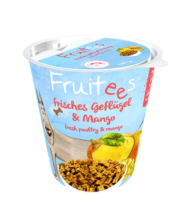 Egyedülálló, kutyáknak szánt snack jutalomfalatként. A Fruitees alapja a friss, fagyasztásmentes baromfihús (20%) és a gyümölcs hozzáadása. A termék rendkívül nedves, így puhább is, mint a normál jutalomfalat! Ezért minden kistestű kutyának is ajánlott. A Fruitees egy praktikus dobozba van zárva, amely frissességmegőrző rendszerrel rendelkezik (többszöri nyitás és zárás).