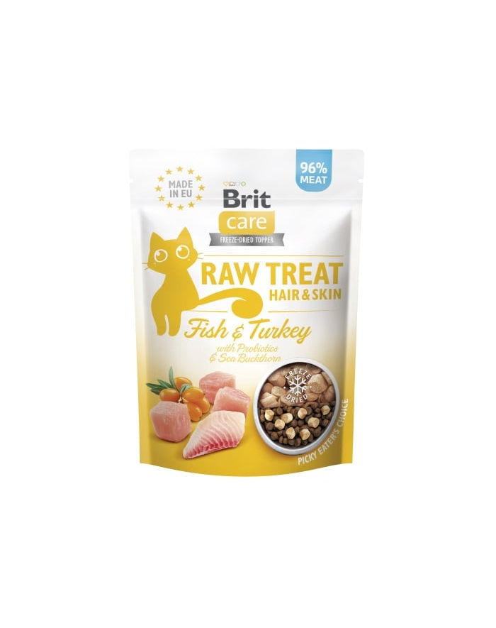 ABRIT Care Raw Treat Cat Hair Skin egy különösen tápláló eledel macskák számára, amely igazán gazdag természetes összetevőket tartalmaz, hogy támogassa kedvence bőrének és szőrzetének egészségét. Az akár 96%-os hústartalommal, valamint homoktövisben és probiotikumokban gazdag, ízletes finomság nemcsak macskája ízlését elégíti ki, hanem alapvető tápanyagokkal is ellátja.