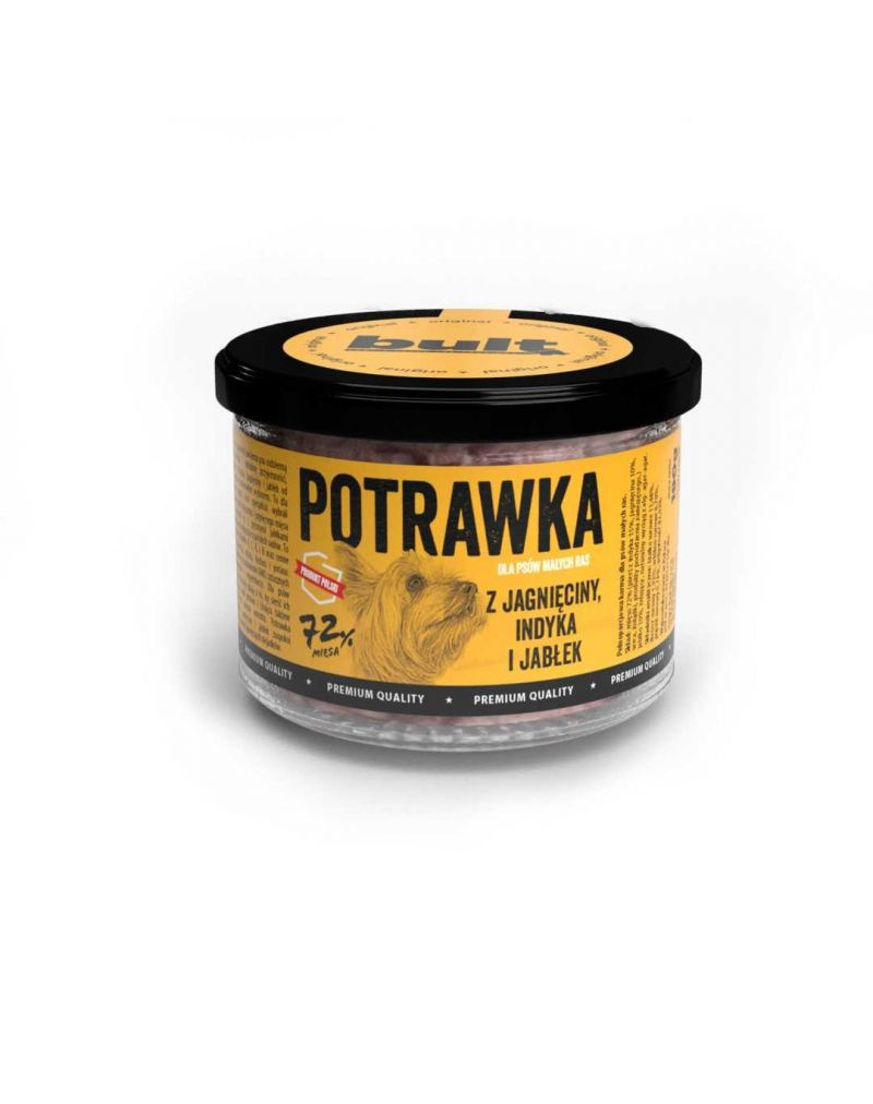 Kutyatál befőttesüvegben bárányhússal, pulykával és hozzáadott almával. A bult tálba a kutyatáplálók a bárány- és pulykahús legjobb falatjait zárták. Az üvegbe lengyel gyümölcsösökből származó édes almát tettek.