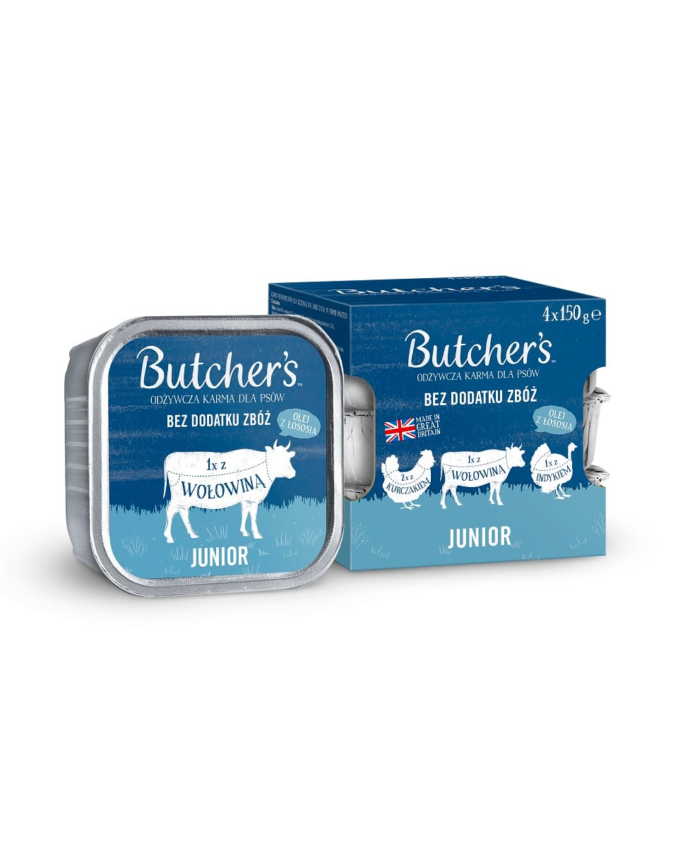 A Butcher's Original Junior gluténmentes eledel kifejezetten a kölyökkutyák táplálkozási igényeihez lett kifejlesztve. Az összetevők megbízható, helyi brit és ír gazdáktól származnak. A termékcsalád termékei gabonamentes, és nem tartalmaznak felesleges töltőanyagokat, sót vagy cukrot. Minden csomagolás környezetbarát.