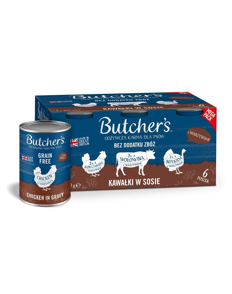 ABUTCHR'S Original Recipe in gravy egy teljes értékű kutyatáp szaftos,mártásban lévő darabok formájában, hozzáadott zöldségekkel. A 3 ízletes ízválasztékkal - csirke és zöldség, pulyka és zöldség, valamint marhahús és zöldség - kedvenceinek változatos ízeket kínál. Ez a természetes eredetű összetevőkön alapuló, tökéletesen kiegyensúlyozott, gabonamentes receptúra minden szükséges tápértéket biztosít kutyájának, hogy egészséges és életerős maradjon.