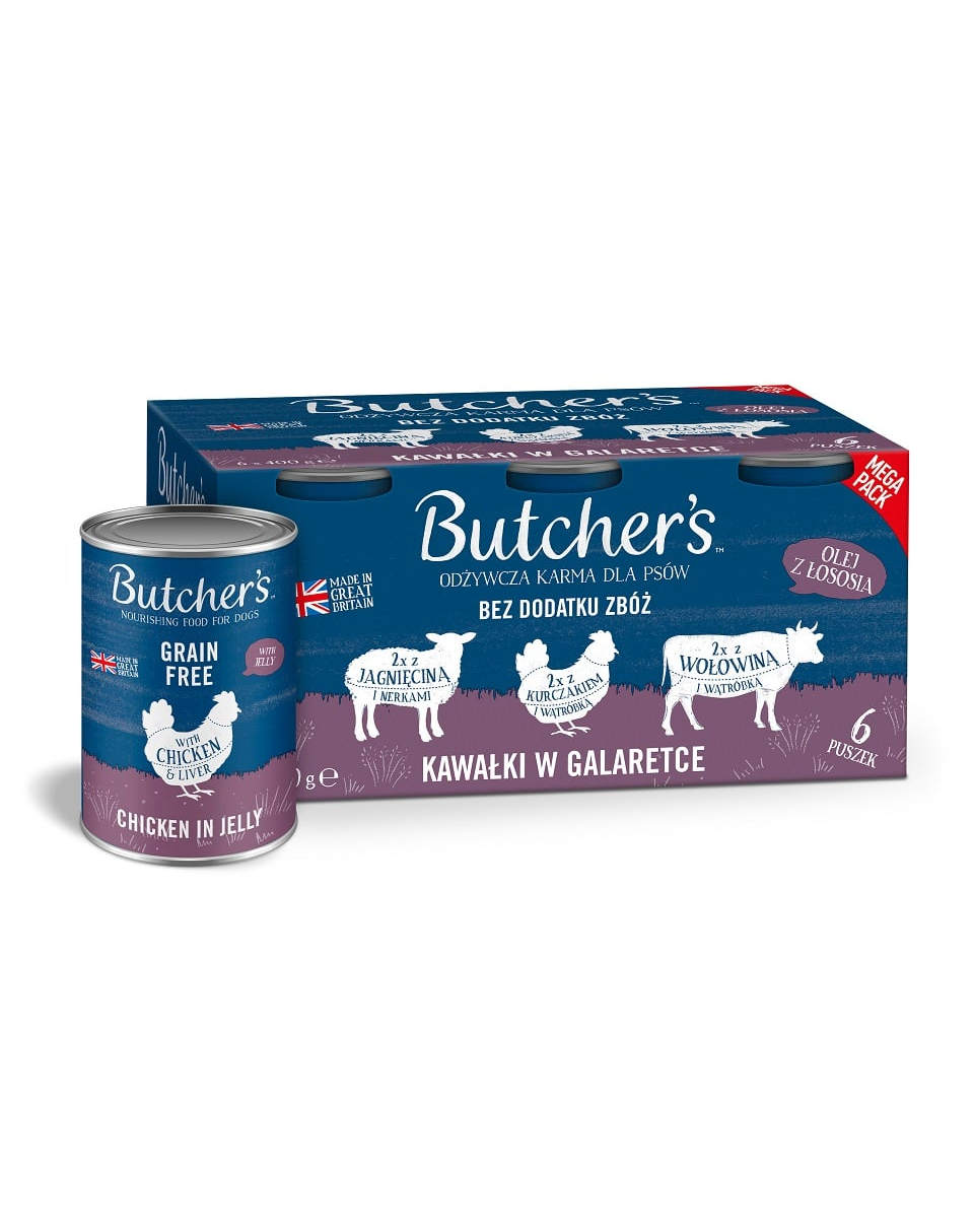 ABUTCHR'S Original Recipe zselében egy teljes értékű kutyatáp, amely nemcsak ízt, hanem számos előnyt is biztosít. A csomagban 6 ízletes változatot talál: 2x csirkével és májjal, 2x bárányhússal és vesével és 2x marhahússal és májjal.