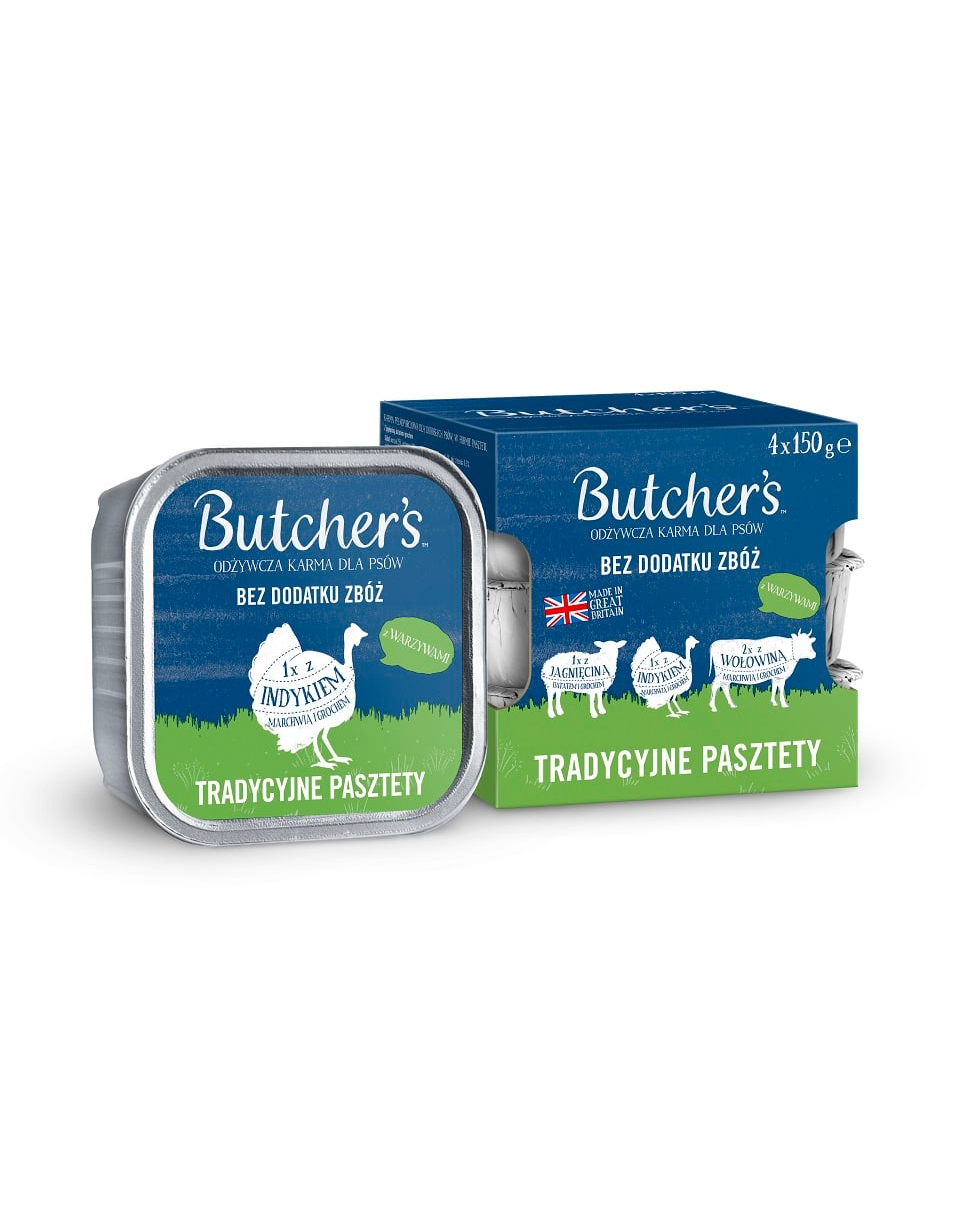 A BUTCHER'S Original Traditional Pate egy teljes értékű kutyatáp finom pástétom formájában. A csomagban 3 ízletes ízváltozatot talál: 1x pulykával, sárgarépával és borsóval, 1x bárányhússal, jamgyökérrel és borsóval, 2x marhahússal, sárgarépával és borsóval. Ez az egyedülálló receptúra csipkebogyó, menta és cikória hozzáadásával biztosítja kutyája számára a napi szükséges tápanyagokat.