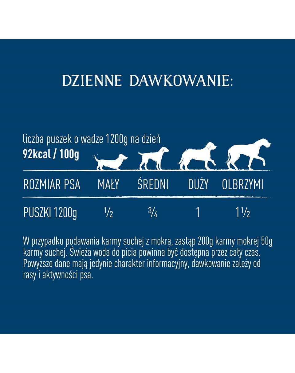 Ha nedves táppal együtt száraz tápot is adunk, 200 g nedves tápot 50 g száraz táppal kell helyettesíteni. Friss ivóvíznek mindig rendelkezésre kell állnia. A mellékelt adatok csak tájékoztató jellegűek, az adagolás a fajtától és az aktivitástól függ.