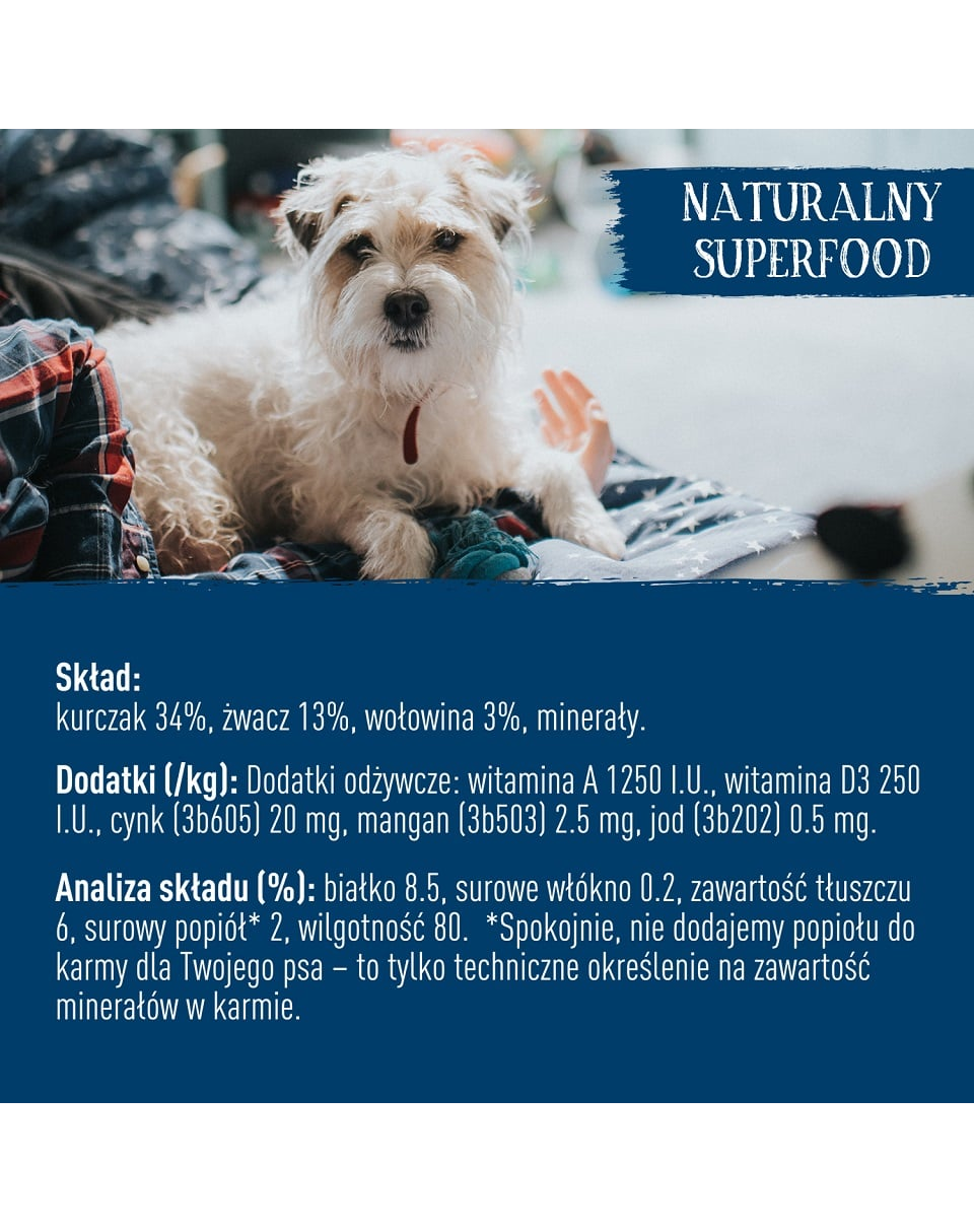 ÖSSZETÉTEL: csirke 34%, bendő 13%, marhahús 3%, ásványi anyagok.