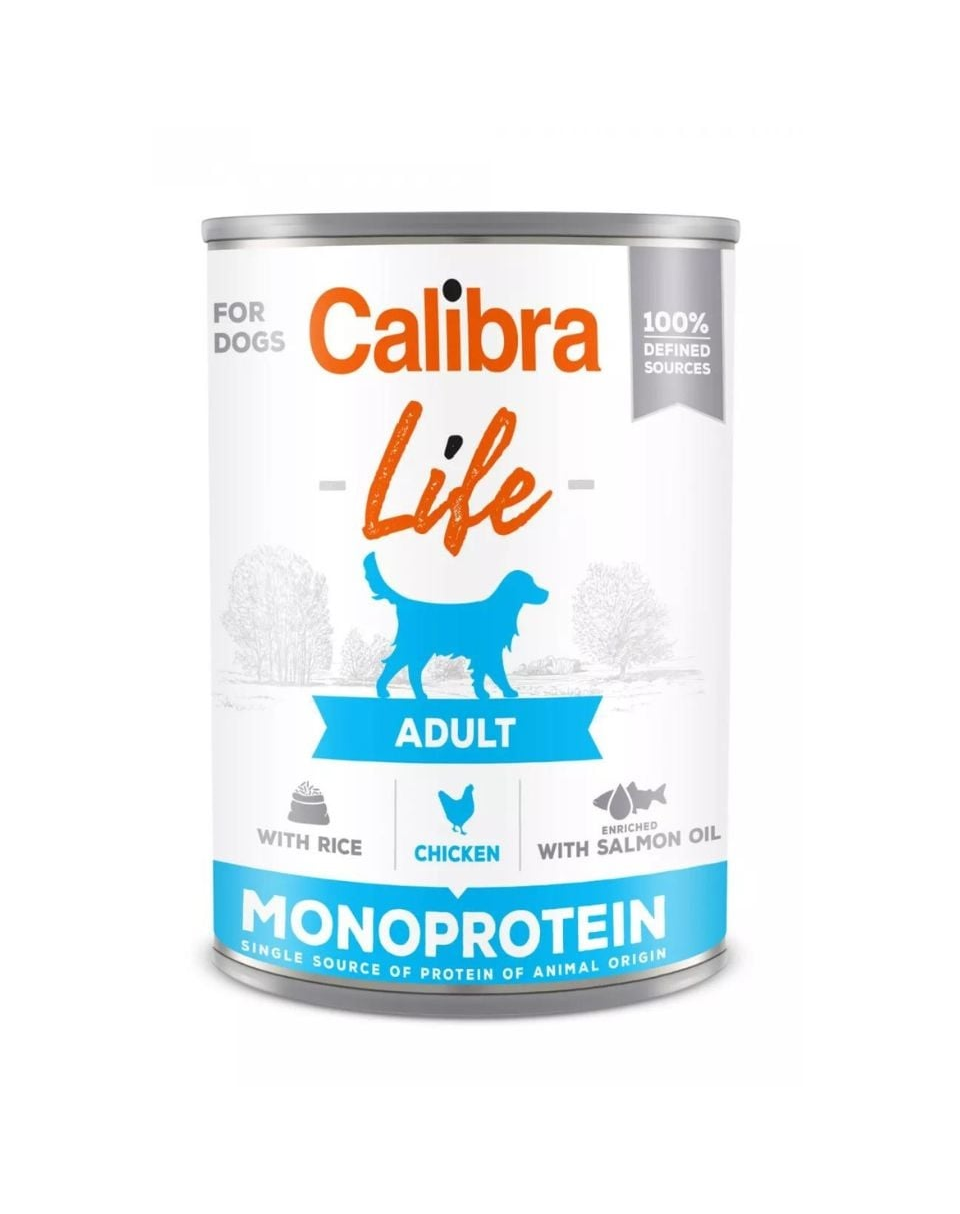 Calibra Dog Life Adult Chicken with Rice - Teljes értékű nedves eledel felnőtt kutyák számára, csirkét, csirkeszívet és rizst tartalmaz.