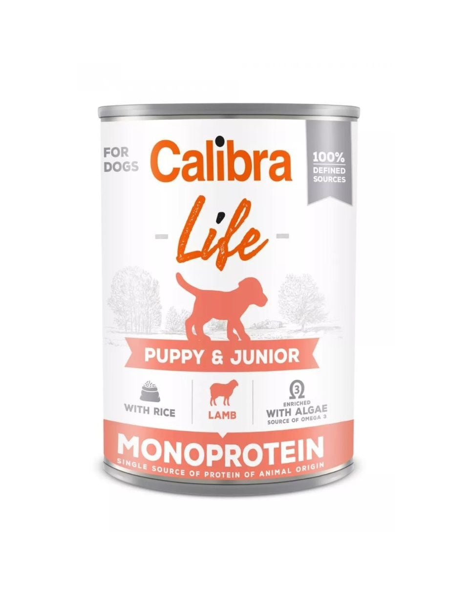 Calibra Dog Life Puppy & Junior Lamb with Rice - Teljes értékű nedves kölyöktáp, amely bárányhúst tartalmaz kölyökkutyáknak és rizst, vemhes és szoptató szukáknak is alkalmas.