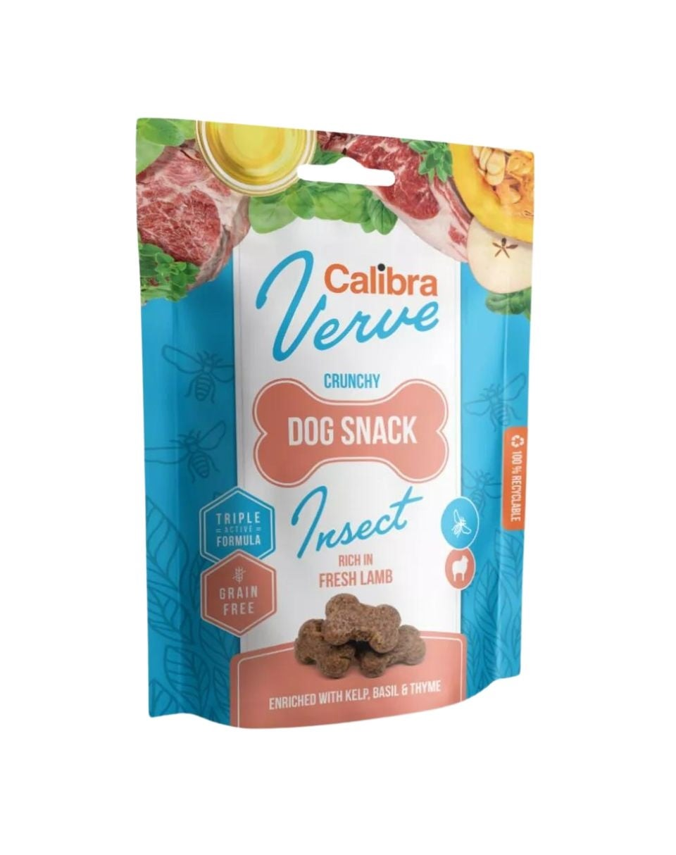 A Calibra Dog Verve Crunchy Snack Insect&Fresh Lamb ropogós és gabonamentes jutalomfalat rovarfehérjével és friss bárányhússal.