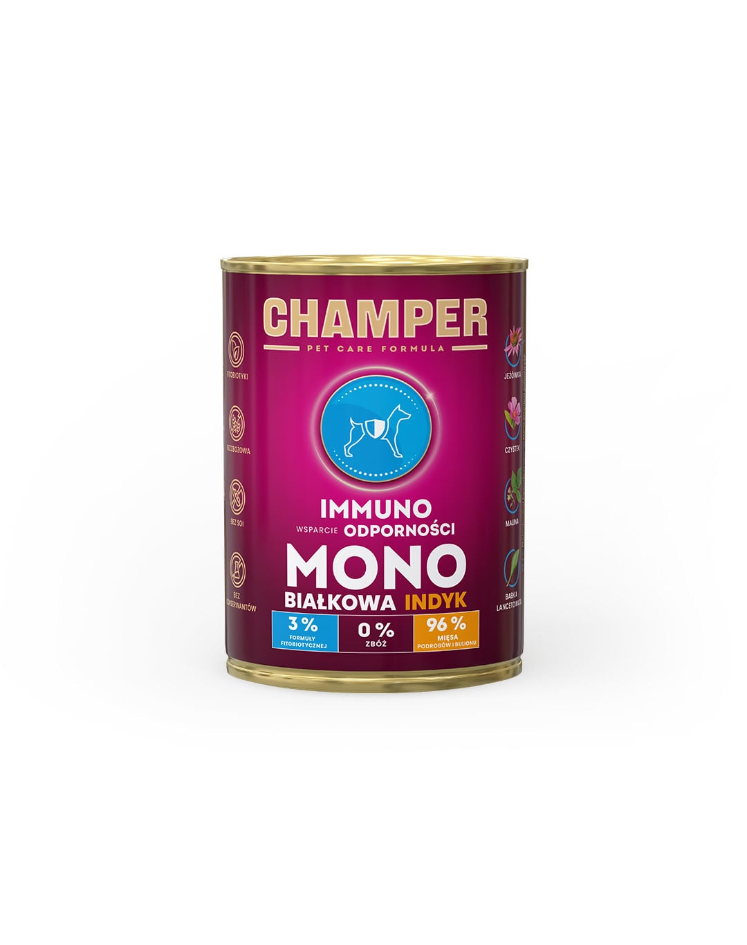 CHAMPER PET CARE FORMULA – INDYK IMMUNOTeljes értékű, monoprotein nedves eledel minden fajtájú kutyáknak
