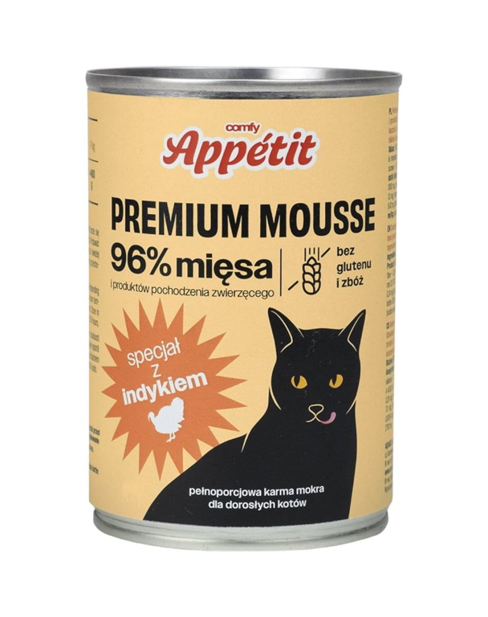 A Comfy Appetit Premium Mousse 96%-ban hús- és állati összetevőket tartalmaz (ebből 28% pulyka), a többi vitaminokból és ásványi anyagokból áll.