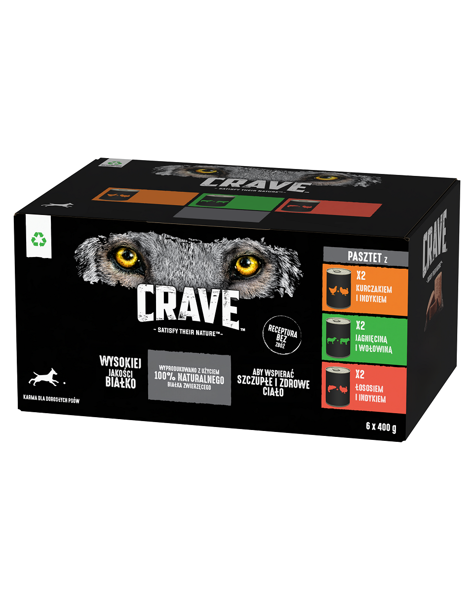A CRAVE csirkével és pulykával, bárányhússal és marhahússal, valamint lazaccal és pulykával teljes értékű és kiegyensúlyozott táplálék a felnőtt kutyák számára. A CRAVE pástétomok húsban és állati termékekben gazdagok. Elősegítik kedvence izomfejlődését és egészséges életét. Magas fehérjetartalmú eledel, hozzáadott gabonafélék nélkül, és az összes, az előállításához felhasznált összetevő kiváló minőségű. Ezáltal kiegyensúlyozott ételt biztosít minden kutya számára, mérettől és fajtától függetlenül.