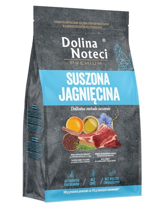 Dolina Noteci Premium Bárány egy teljes értékű, szárított táp felnőtt macskák számára, minden fajtára, teljes mértékben alkalmazkodva természetes táplálkozási igényeikhez és húsevő jellegükhöz.