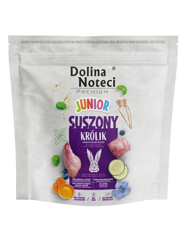Dolina Noteci Premium Junior nyúl egy teljes értékű, szárított táplálék kutyáknak, amely közepes és nagy testű kölyökkutyák és fiatal kutyák számára készült.