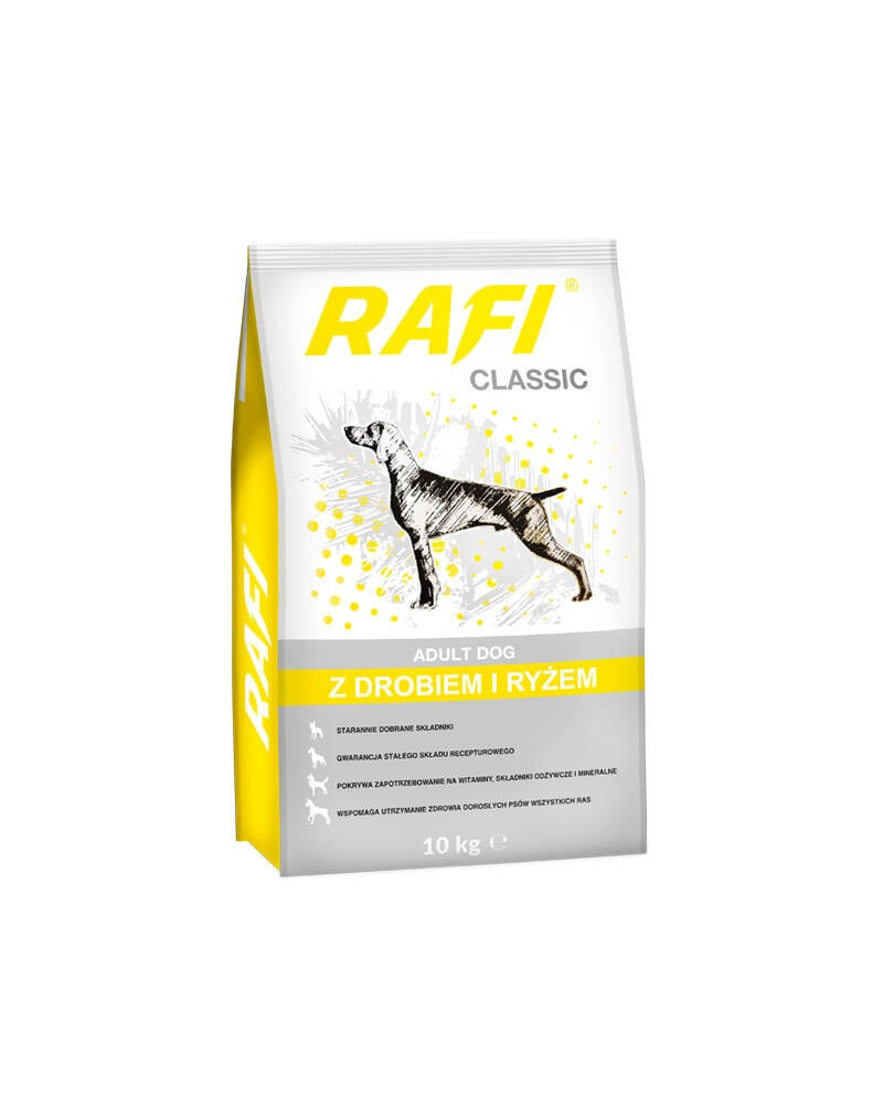 Rafi Classic csirkével és rizzsel egy teljes értékű száraz kutyatáp felnőtt kutyák számára. A táp receptúrája kiegyensúlyozott, és figyelembe veszi az összes tápanyag, vitamin és ásványi anyag szükségletét, amelyek elengedhetetlenek a kutya egészségének és jó kondíciójának megőrzéséhez. Ennek köszönhetően a táp egyedüli táplálékot jelenthet a kutya számára.< /P>