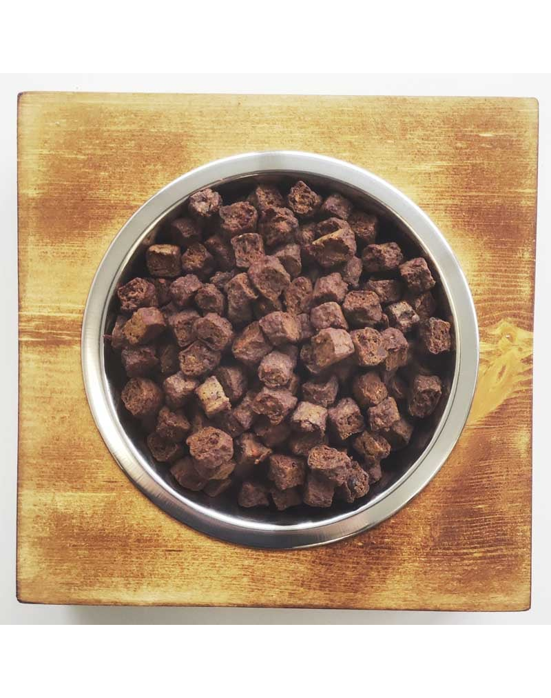 100 g késztermék legfeljebb 200 g friss húsból és állati eredetű libából, marhából, csirkéből és sertéshúsból készült friss húsból és állati termékekből készül. A tápszer legfeljebb 80%-ban húsból és abból származó termékekből áll. Az állati fehérje magas aránya, valamint a különböző 4 típus mellett, jól emészthetővé teszi az ételt, és nem okoz gyomorproblémákat. A kiváló minőségű aminosavak erősítik a kutya kondícióját, és biztosítják az izmok és a kutya teljes vázrendszerének jó fejlődését és regenerálódását. Az ételek holisztikusak, teljesen kiegyensúlyozottak és változatos összetevőket tartalmaznak.