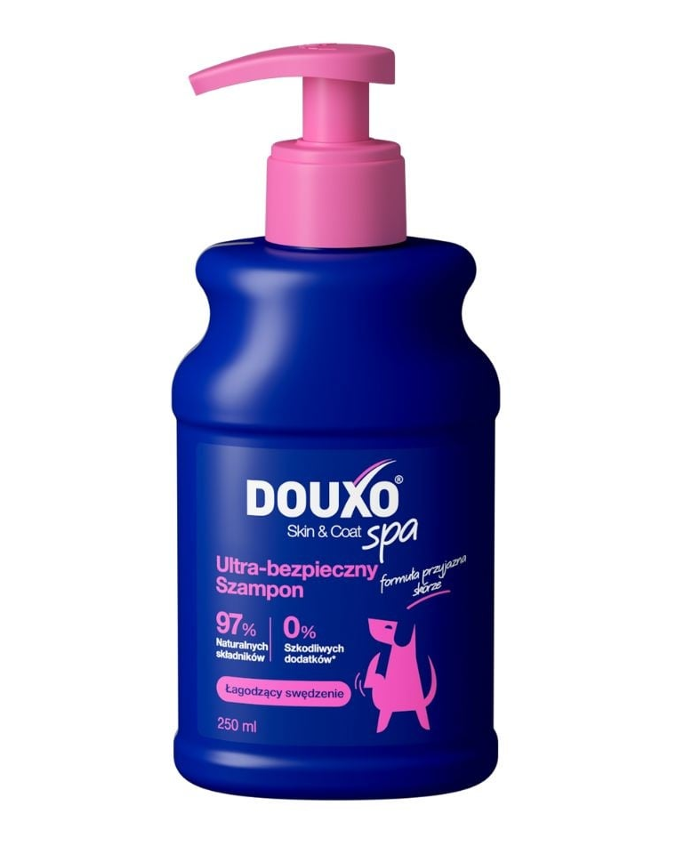 DOUXO Skin & Coat SPA Ultra-biztonságos sampon kutyák számára, akiknek érzékeny és viszkető a bőrük. Kíméletesen tisztítja a bőrt és enyhíti a kényelmetlenséget, táplálja a szőrt, puha és fényes érzetet hagyva. Bőrbarát formula.