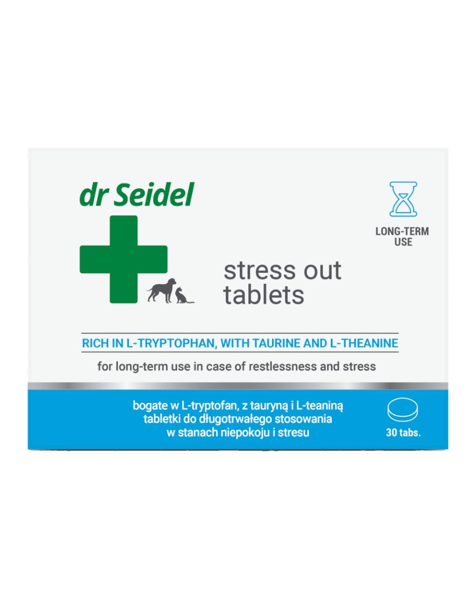 Stress Out Tabletek egy speciális kiegészítő táplálék, amely kutyák és macskák számára készült krónikus stressz és szorongás esetén. A tabletták segítenek enyhíteni a tartós stressz hatásait, és támogatják a viselkedésterápiát érzékeny és szeparációs szorongásra, hiperaktivitásra vagy alkalmazkodási problémákra hajlamos állatok esetében.