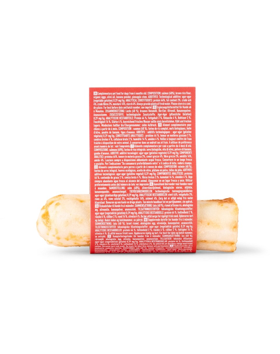 ÖSSZETEVŐK: lazac (48%), barna rizsliszt, bio tojás, olívaolaj, banánpor, ananász szár.