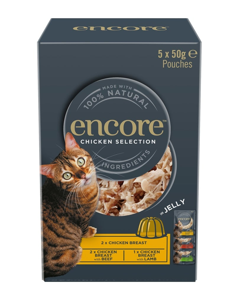 ENCORE Cat Adult Chicken Selection in Jelly egy természetes kiegészítő táplálék felnőtt macskák számára, amely 5 db 50 g-os tasakból álló multipakként érhető el. A csomag különböző ízvariációkat kínál csirkemell alapú, könnyű, ízletes zselében (“in Jelly”), ami fokozza az étkezés vonzerejét. A termék formulája természetes összetevőkre épül, mesterséges színezékek és tartósítószerek nélkül.