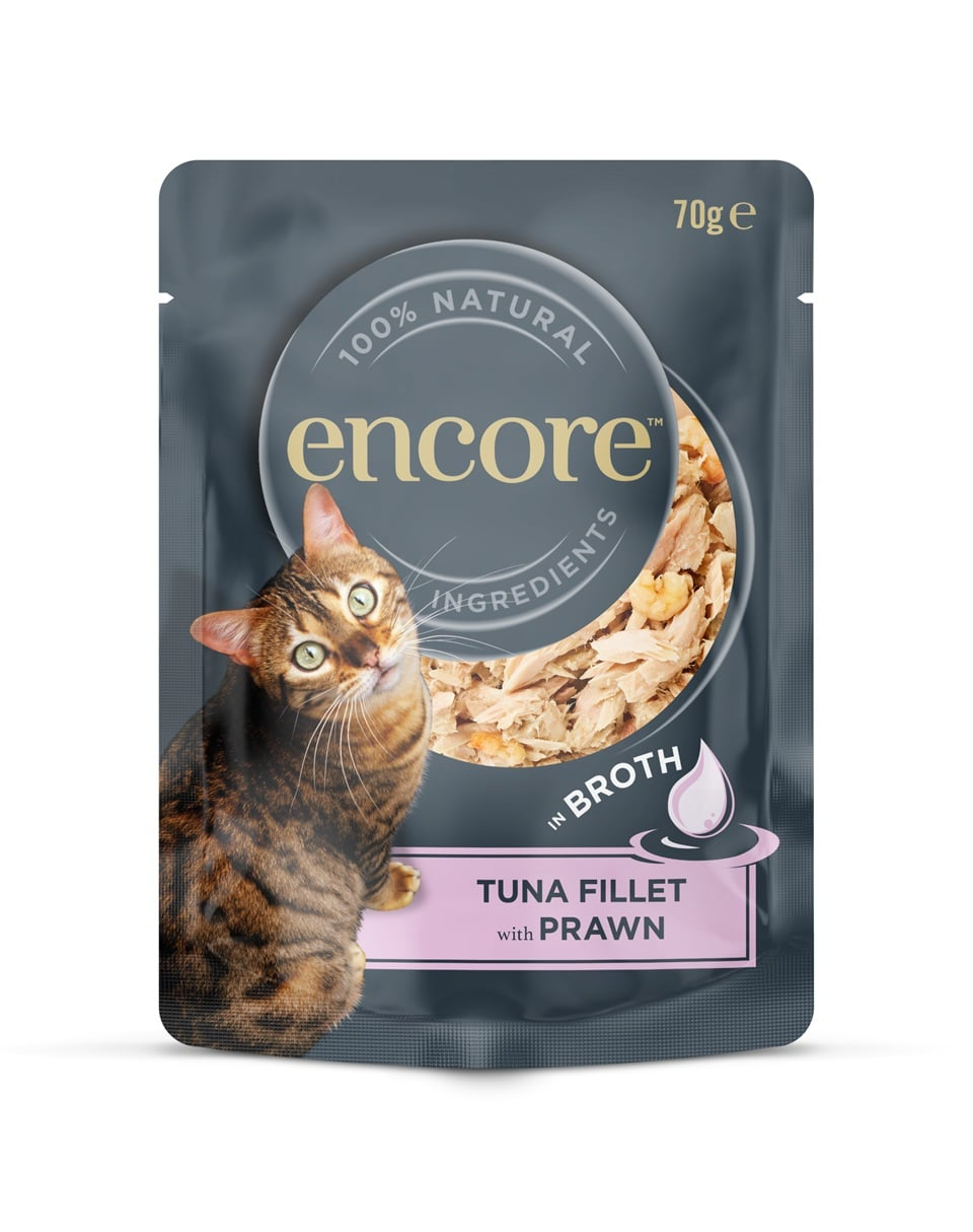 ENCORE Cat Adult Tuna Fillet with Prawn in Broth – finom, tonhal filé garnélával, rendkívül könnyű húslevest tartalmaz.