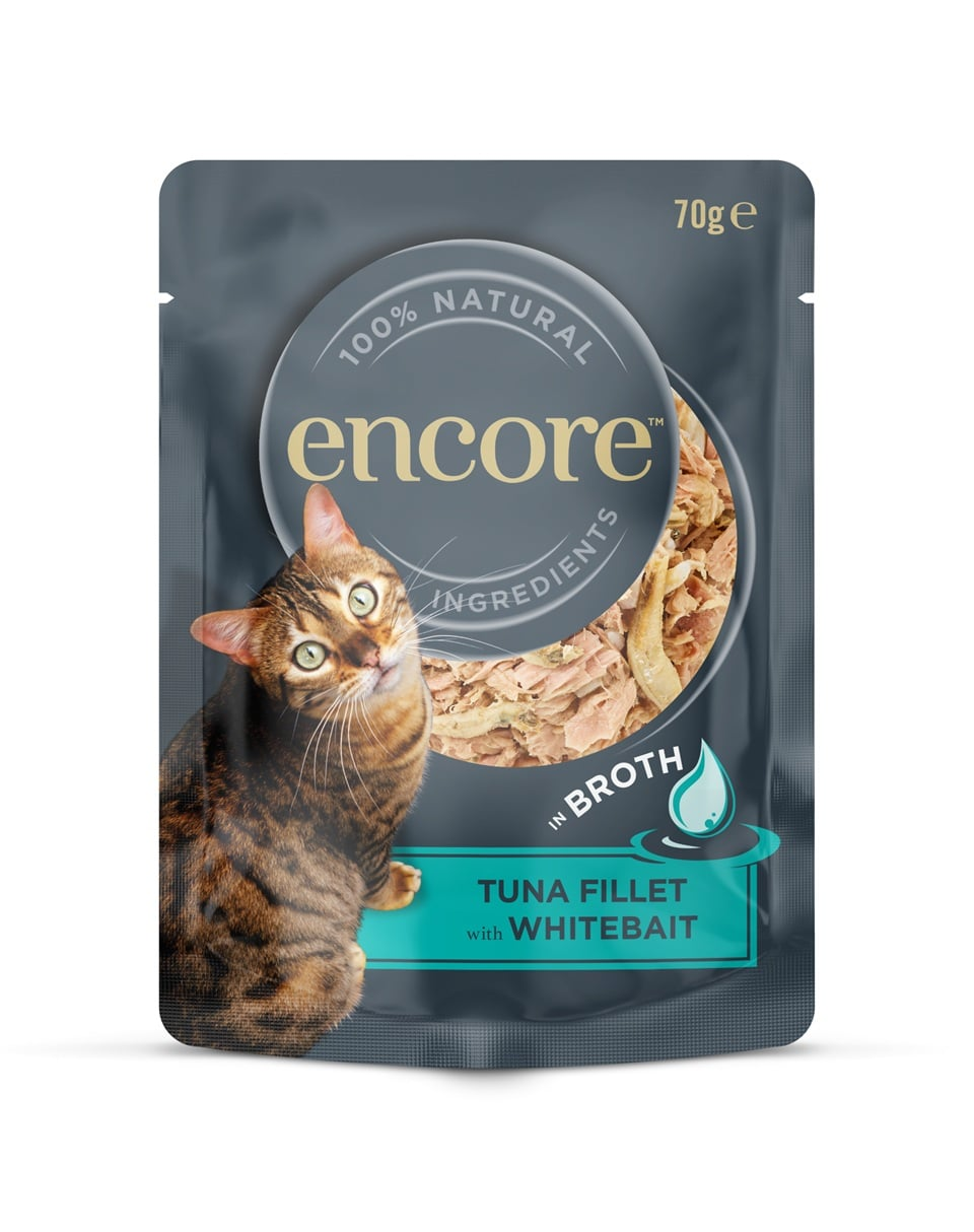 Encore Cat Adult Tuna Fillet with Whitebait in Broth egy természetes, gabonamentes kiegészítő táplálék felnőtt macskák számára. Magas minőségű tonhal filét ötvöz fehérhallal (whitebait), amelyet egy könnyű húslevelben áztatnak, ízletes és könnyen emészthető receptet alkotva. A táplálék mesterséges színezékek, aromák és tartósítószerek nélkül készült — ideális olyan macskák számára, akik természetes étrendre vágynak.