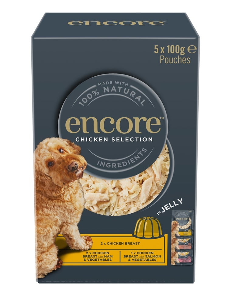 ENCORE Dog Chicken Selection in Jelly Multipak 5×100 g egy természetes táplálékkiegészítő felnőtt kutyák számára, ízletes tasakok formájában, finom csirkemell zselében tálalva. Minden változat egyszerű és érthető összetevőkből áll, mesterséges színezékek, tartósítószerek és felesleges töltőanyagok nélkül — ideális a kutya napi étrendjének változatossá tételére.