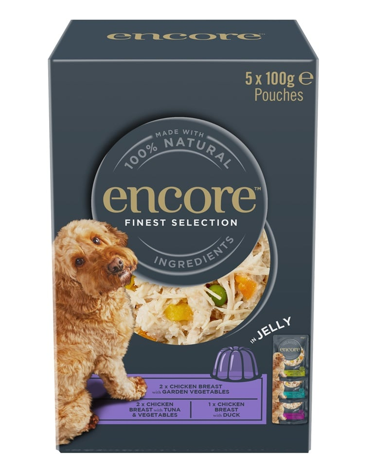 ENCORE Dog Finest Selection in Jelly a legmagasabb minőségű kiegészítő táplálék multipak formájában - 5 tasak 100 g-os kiszerelésben - kifejezetten felnőtt kutyák számára készült, akiknek ízletes és természetes zselés változatokat szeretnél kínálni. A receptúra magas minőségű hús összetevőkre épül, felesleges adalékanyagok és gabona töltőanyagok nélkül, ami lehetővé teszi, hogy kutyád étkezéseit íz és minőség szempontjából változatosabbá tedd.