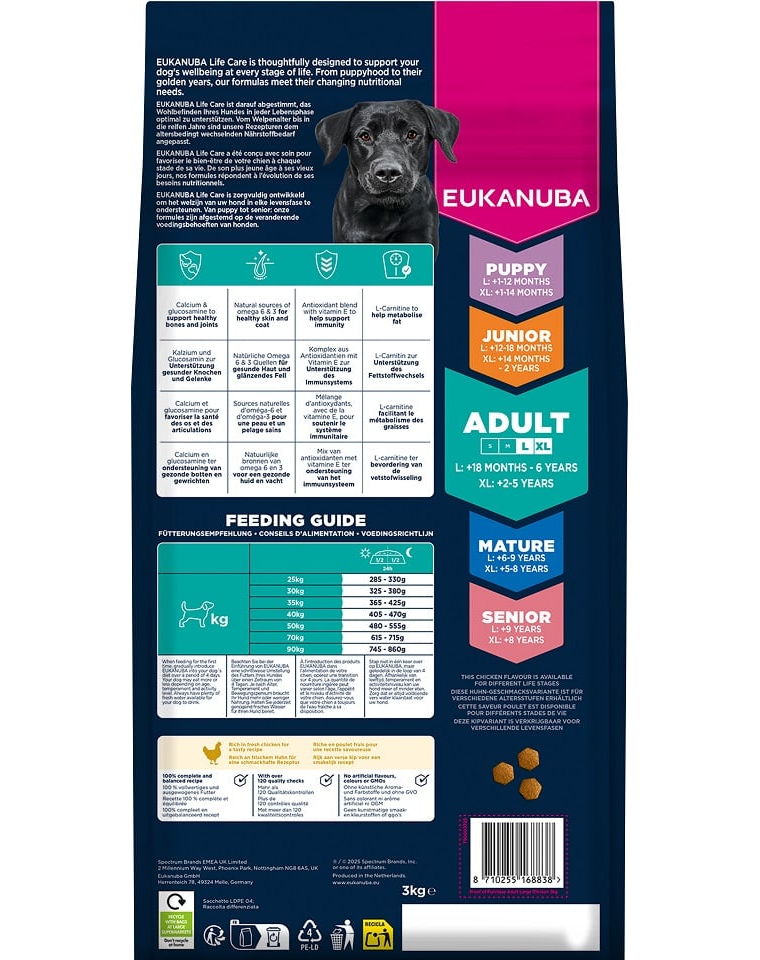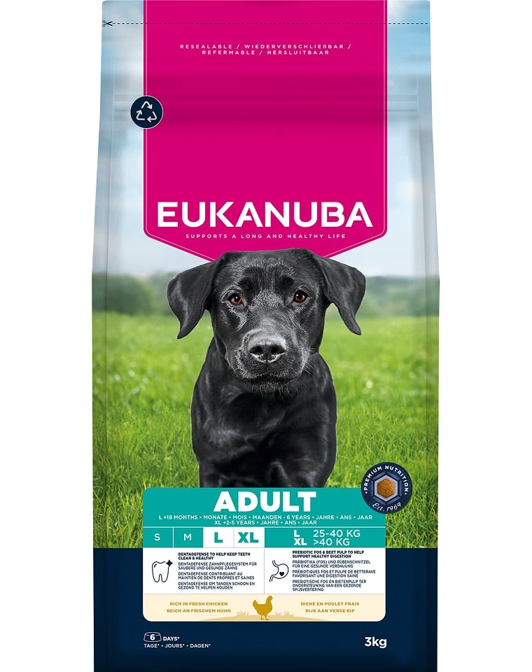 A száraz EUKANUBA kutyatáp felnőtt kutyák számára, friss csirkével gazdagítva, 100%-ban teljes és kiegyensúlyozott, és ideális nagytestű fajták számára 18 hónapos kortól 6 éves korig (vagy 2–5 éves korig óriás fajták esetén).